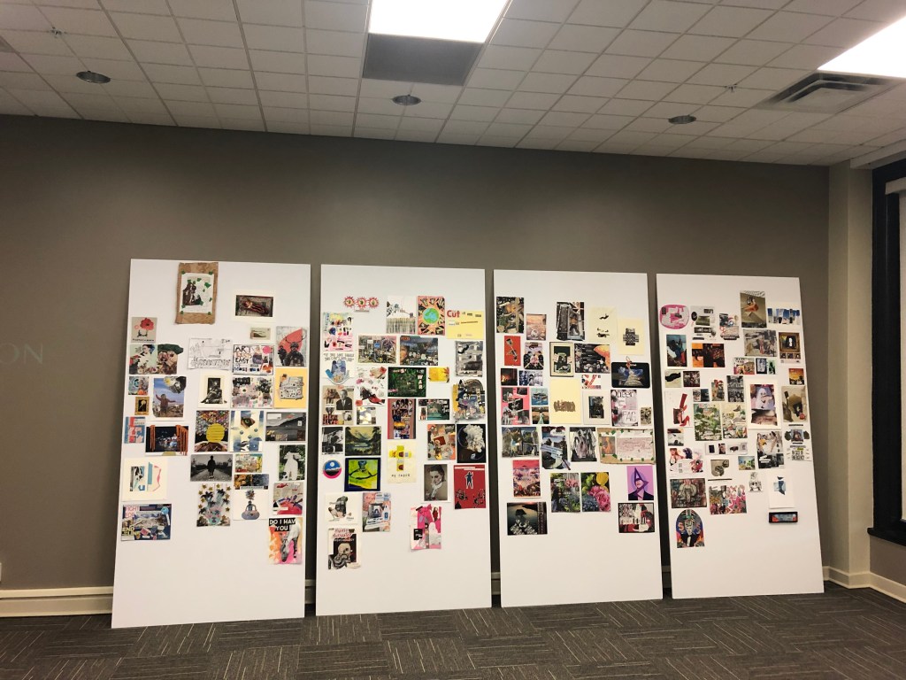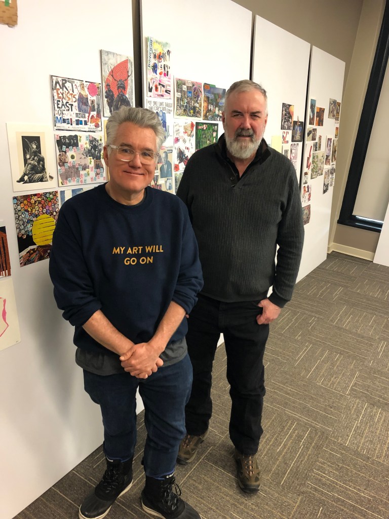 RM Vaughan Ken Moffatt curators; Installation view, Cut Paste Resist: Install R M Vaughan with Marie E Maltais, Director, UNB Art Centre. University of New Brunswick, February 10, 2020.