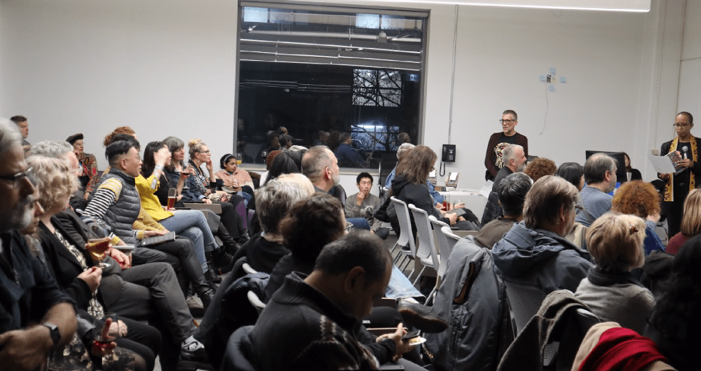 Postmodern Social Work book launch, at Toronto Metropolitan University. Back of the room, Keith Cole, Rea McNamara. Standing at front of room Randy Jackson Kiké Roach. November 2019